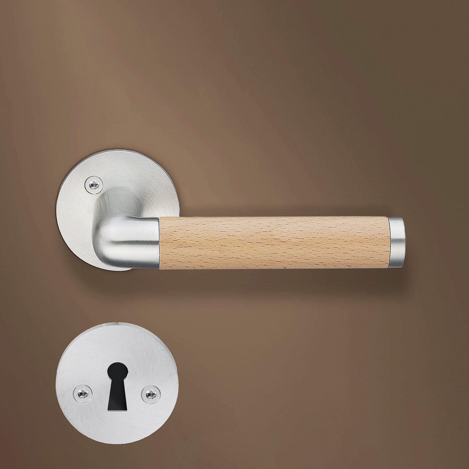 Børstet krom med grep av eik.