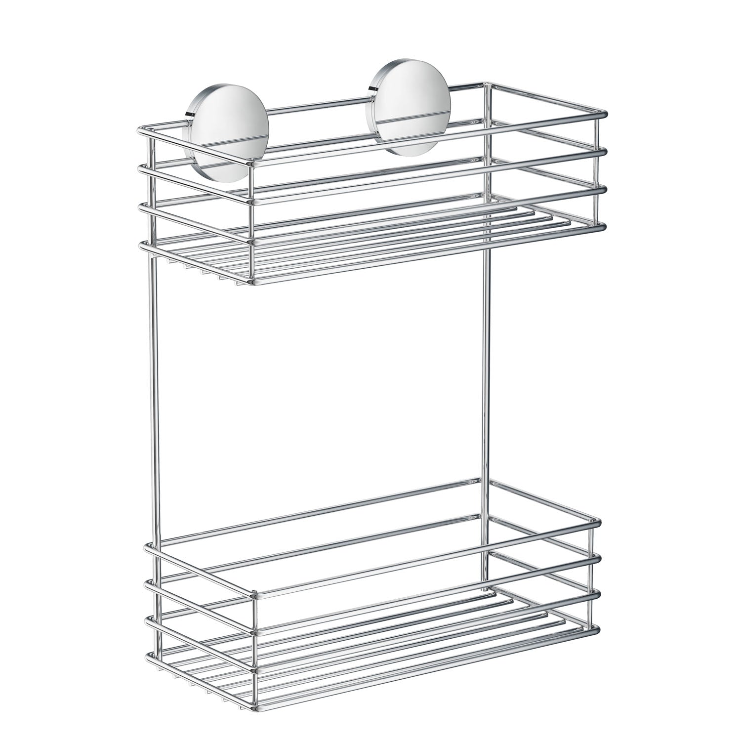 BESLAGSBODEN Double Shower Basket. Polished Chrome on Stainless Steel. Self-adhesive. Length 250 mm. Height 320 mm. Depth 120 mm. Holder 60 mm.