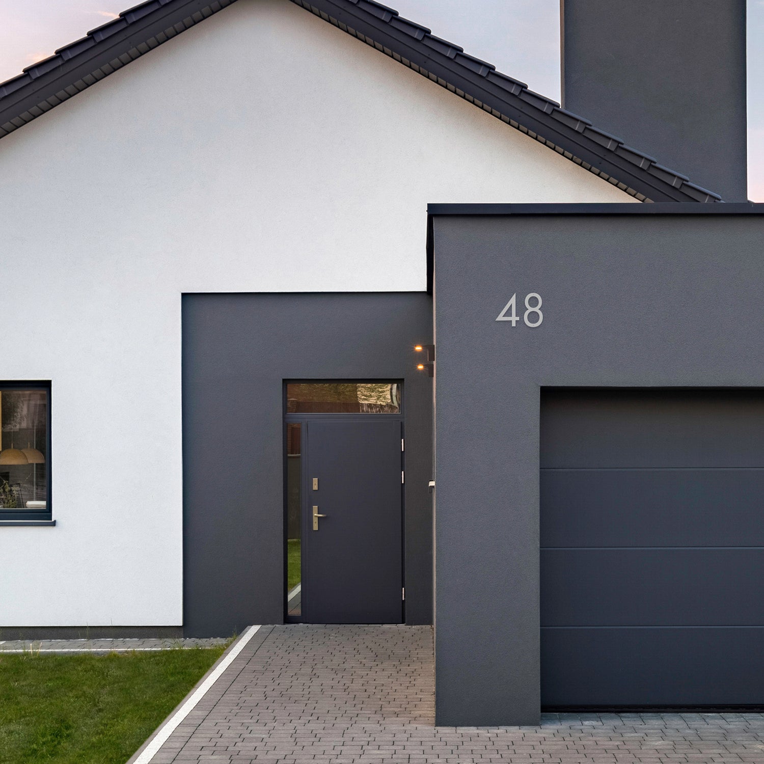 NORDIC House Number 4. Matt grey. Height 230 mm. Complete with screws, spacers and plugs.