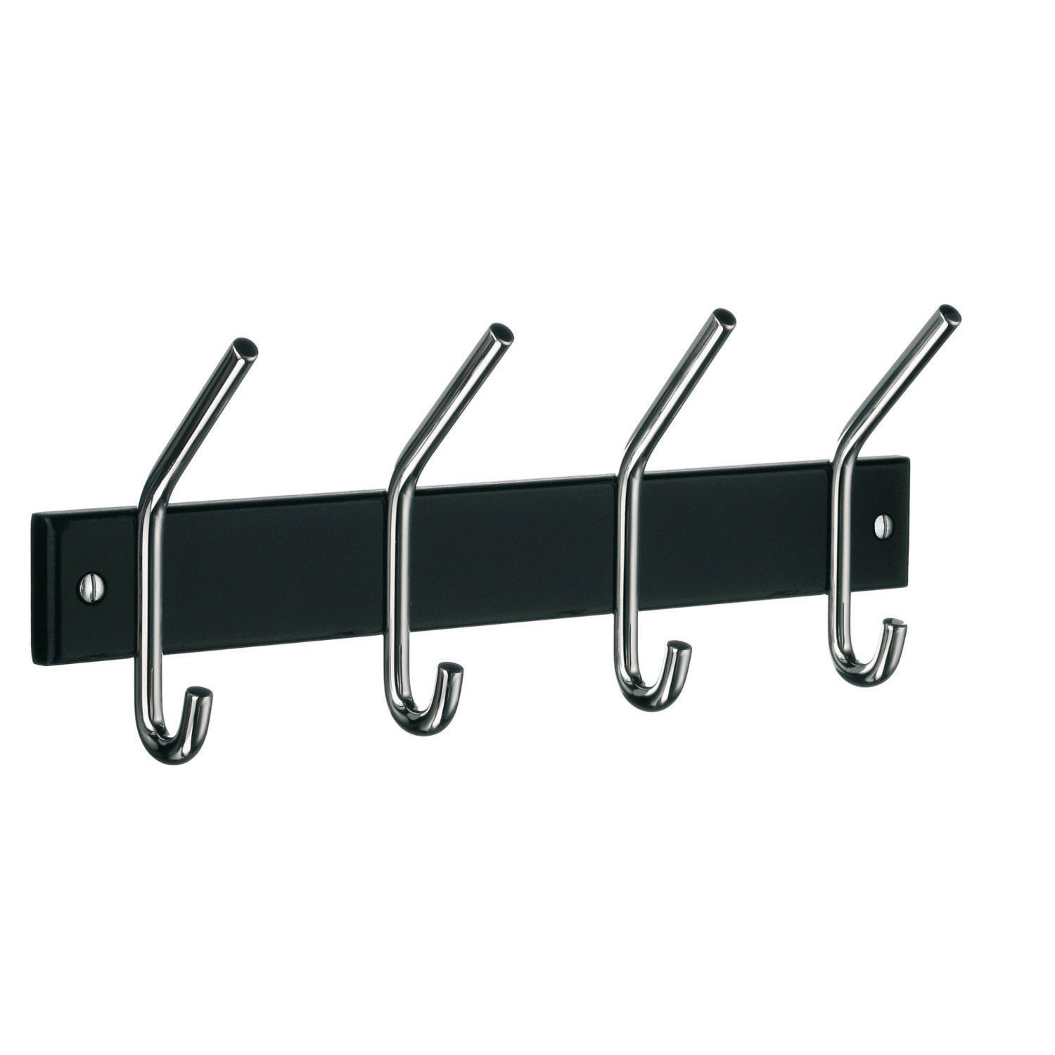BESLAGSBODEN Coat and Hat Rack, Quadruple. Chrome Stainless Steel/Black wood. 300 x 40 mm. Hook Height 120 mm.