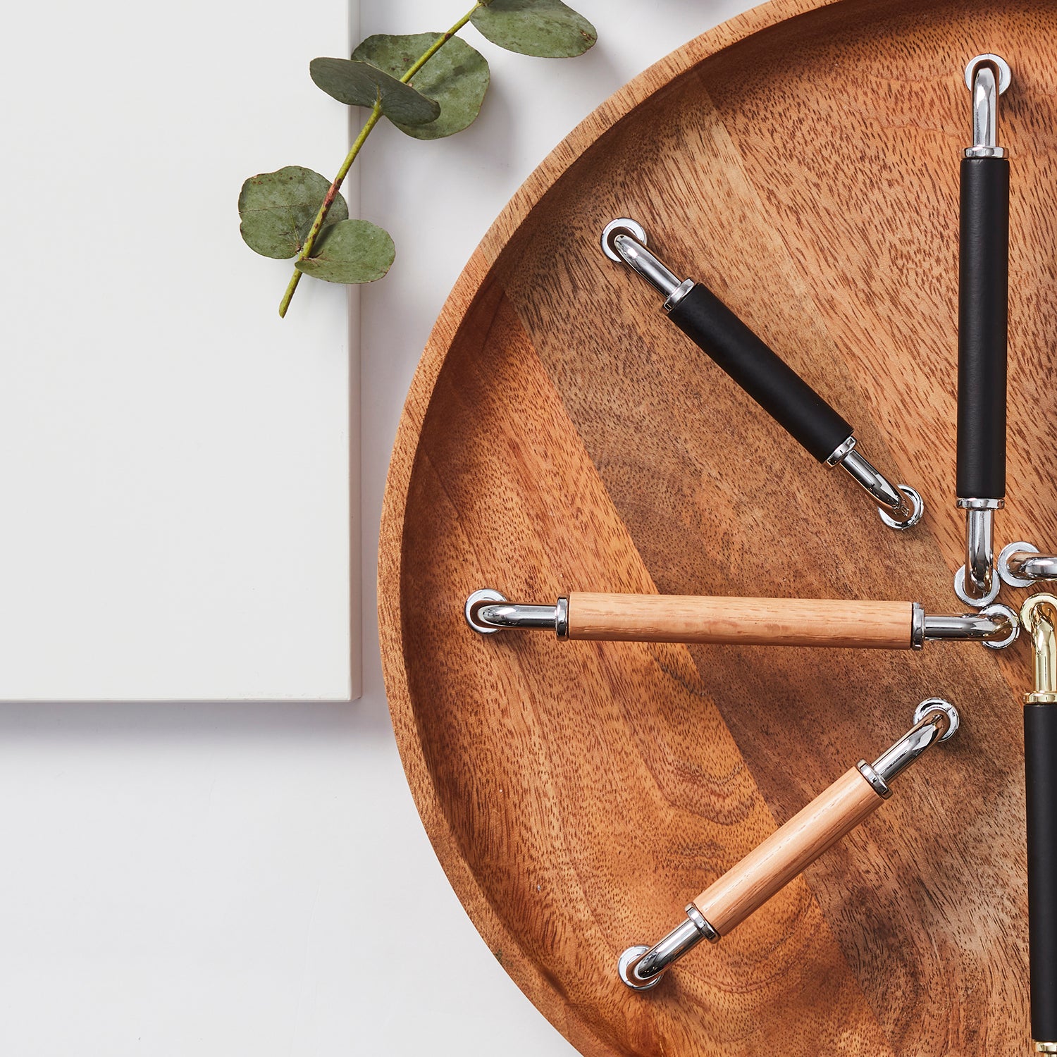 A unique combination of materials. Polished chrome meets wood in a handle that blends warmth with modernity. The natural wood grain contrasts beautifully with the shiny chrome finish, creating a lively and inviting look.