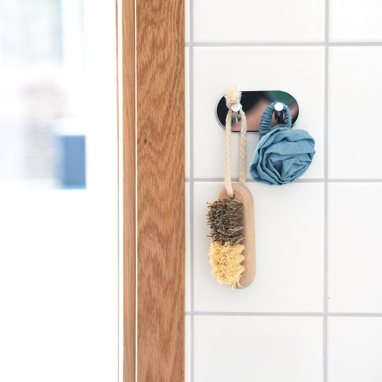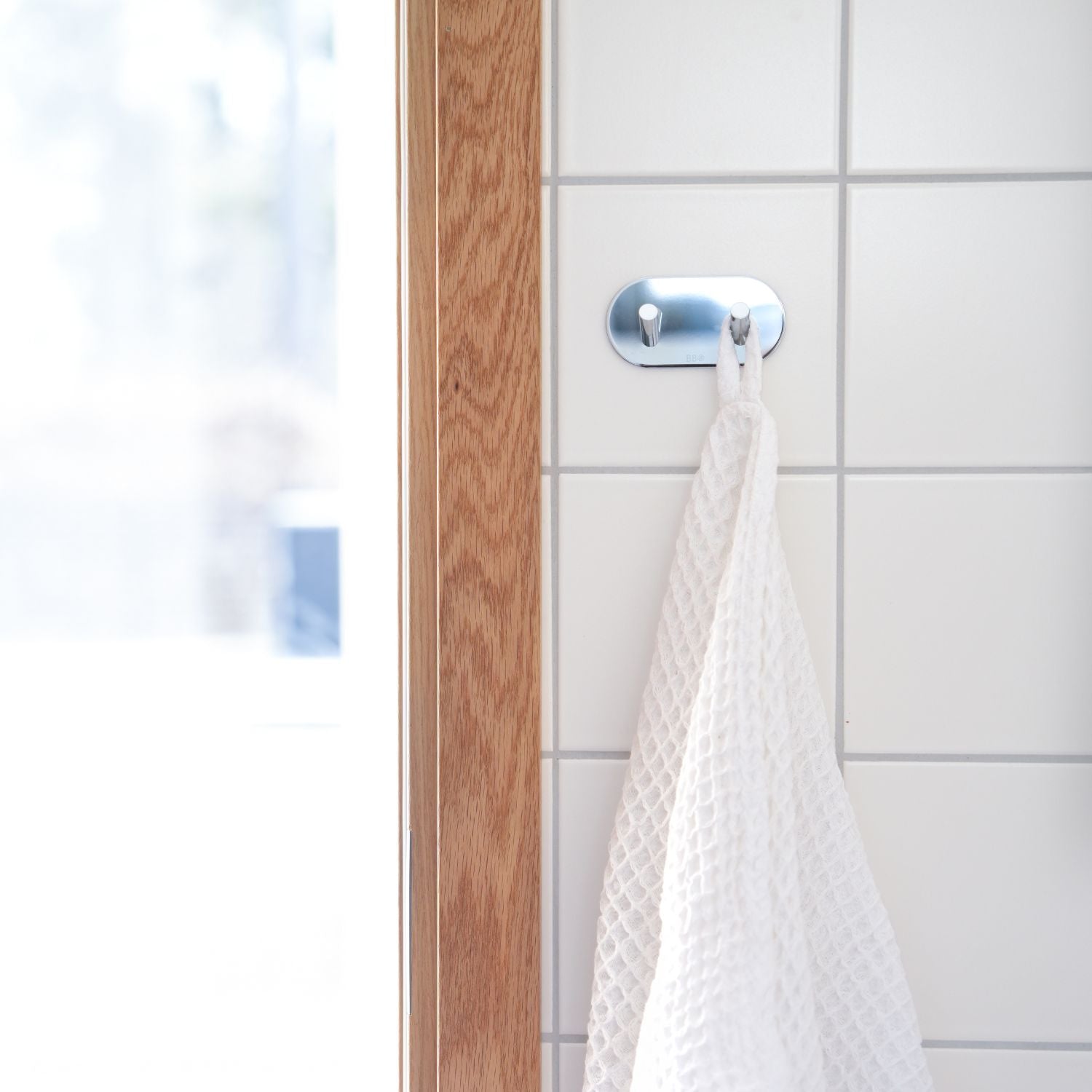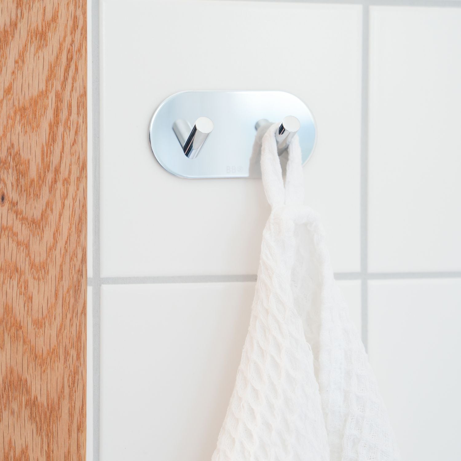 BESLAGSBODEN Design Double Hook. Polished Stainless Steel. Self-adhesive. Length 96 mm.