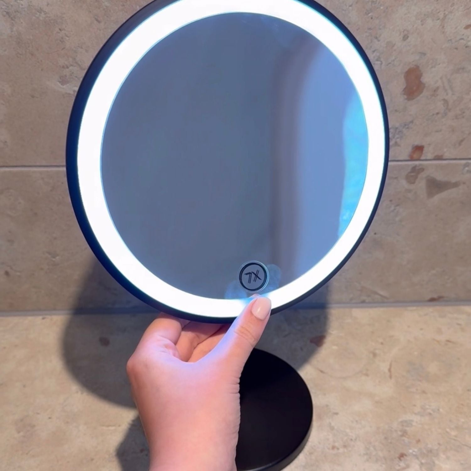 GLOW Make-up Mirror. Black. Free Standing. LED Light. Rechargeable battery, charge with USB. Magnifies 7 times. Mirror Diameter 200 mm. Height 335 mm.