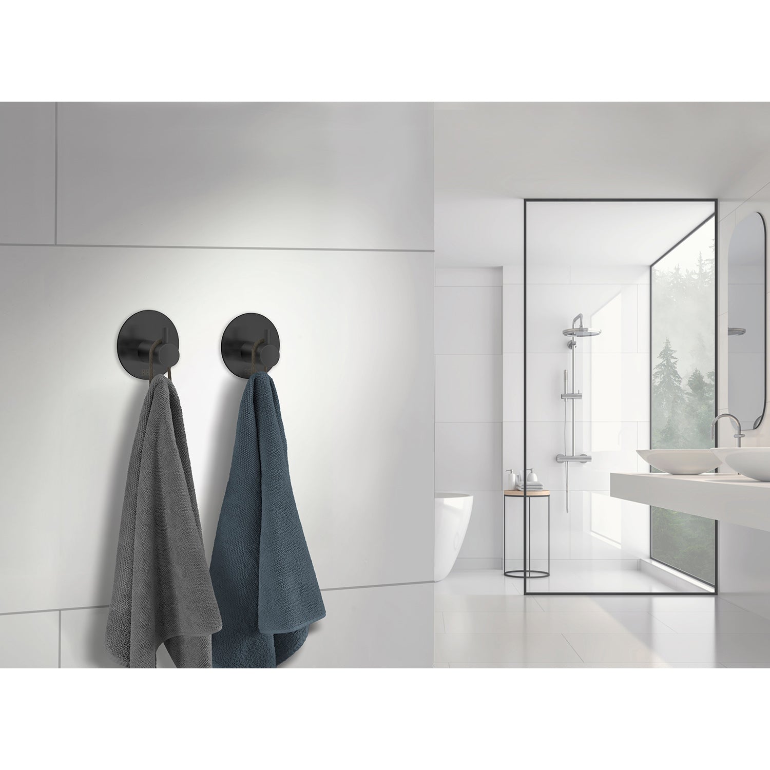 Självhäftande handdukskrok med en stilfull rund bakplatta. Enkelkroken är mattsvart och ger ett stilrent uttryck till ditt badrum.