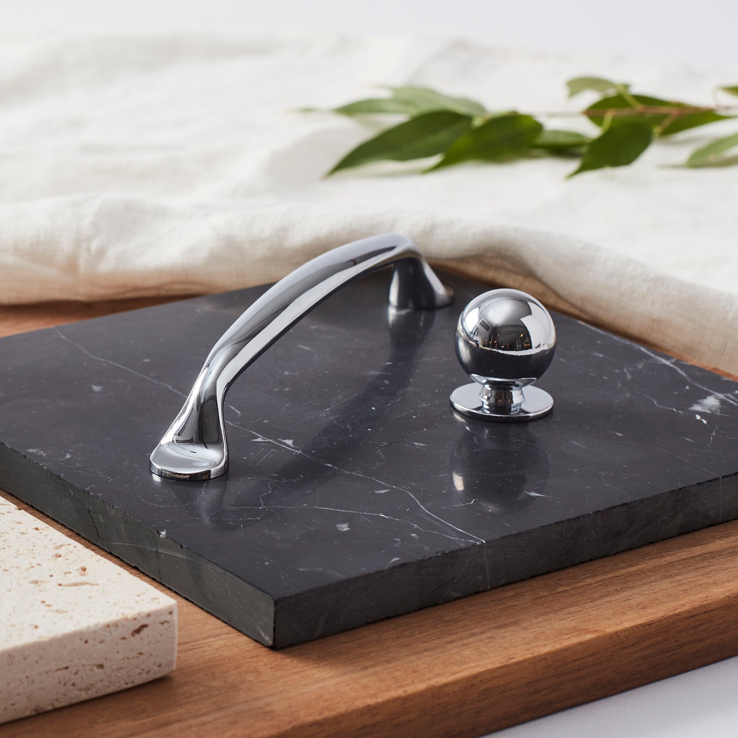 Ett handtag i polerad krom som adderar en exklusiv glans. Den reflekterande ytan gör att det fångar ljuset och ger rummet en känsla av modern lyx. En detalj som höjer både möbler och inredning.